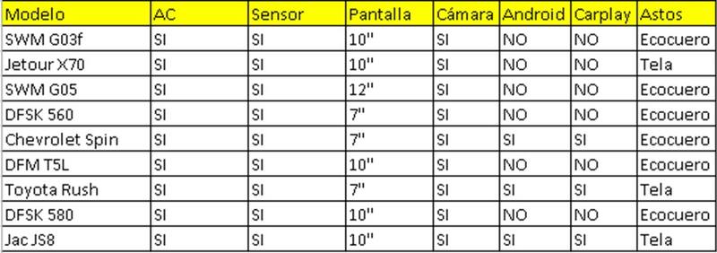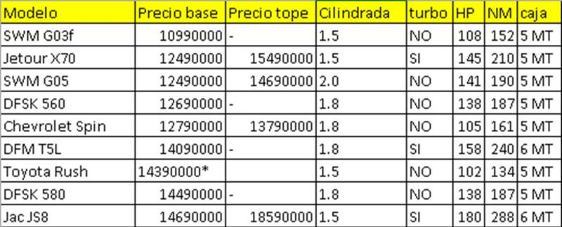Los nueve modelos tienen motores entre 1.5 y 2.0 litros. Algunos ofrecen turbo y otros son aspirados, por lo que sus rangos de potencia oscilan entre los 102 HP como mínimo (Toyota Rush) y alcanzan hasta 180 HP como máximo (Jac JS8). Todas las alternativas ofrecidas tienen caja manual de 5 marchas, salvo los DFM T5L y Jac JS8 que tienen caja manual de 6 marchas.