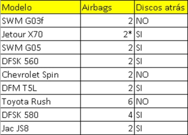 Todos los modelos ofrecen una dotación de seguridad compuesta por 2 airbags, frenos ABS, control de estabilidad ESP, control de tracción, asistencia al arranque en pendientes y varios ofrecen monitor de presión de neumáticos. Como rasgos diferenciadores, todos tienen frenos de disco en las 4 ruedas, salvo los SWM G03f, Chevrolet Spin y Toyota Rush. Además, el DFSK tiene airbags laterales delanteros, mientras que el Toyota Rush ofrece 6 airbags en todas sus versiones. En el caso del Jetour X70, habrá que ir a la versión intermedia para encontrar 4 bolsas de aire.