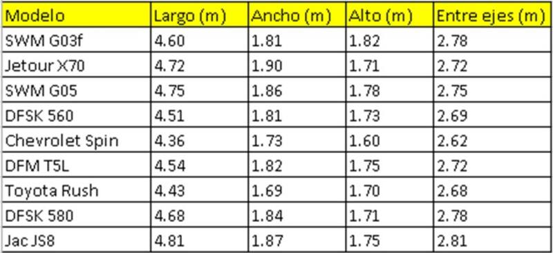 En cuanto a tamaños, los resultados son bastante dispares, siendo el Chevrolet Spin y Toyota Rush los modelos más compactos, con menos de 4.5 metros de largo. Los otros rivales sobrepasan con creces esa cifra, siendo el Jac JS8 el modelo más grande con 4.81 metros de largo.