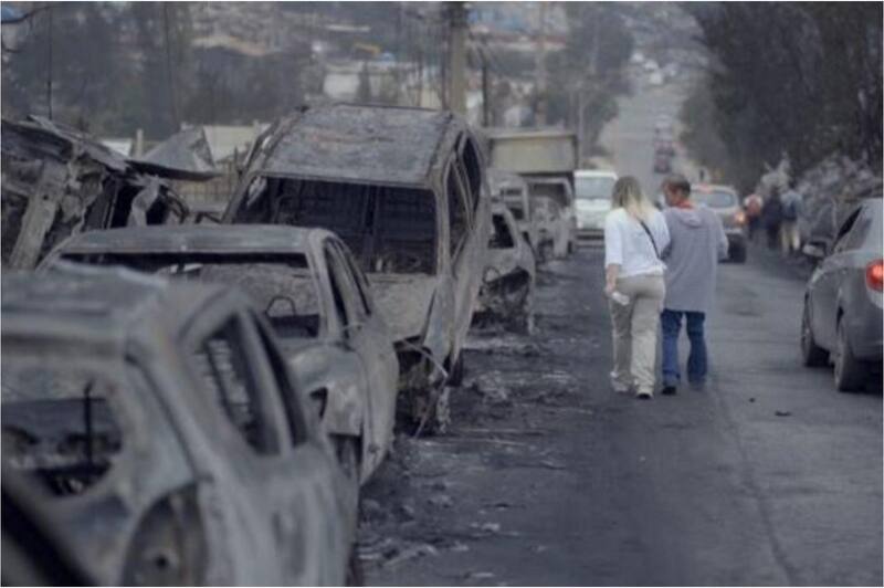 Una de las postales más duras para comprender la magnitud de la catástrofe en Viña del Mar y sus alrededores fueron las tomas aéreas que daban cuenta no solo de los daños en las zonas boscosas, sino también en las zonas urbanas, con restos de casas y autos totalmente calcinados en lugares donde antes existían barrios llenos de movimiento. Y es que fueron tantas las personas que en la desesperación de escapar provocaron colapsos de tránsito, que finalmente optaron por abandonar sus vehículos, los cuales fueron alcanzados posteriormente por el fuego.