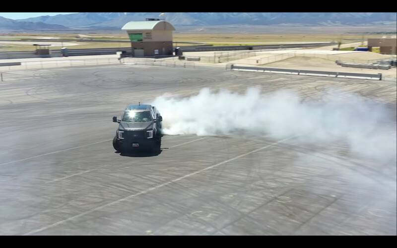 Podrás imaginarte que derrapar en un vehículo pesado y con motor diésel no ha resultado una tarea sencilla, pero Block tiene experiencia. Sabe cómo levantar humo incluso con doble rodado trasero y sin peso en el pick-up...