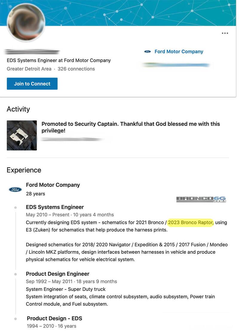 Esta información filtrada de la red social de perfiles profesionales, da pistas de una eventual respuesta de Ford para el Wrangler V8 que Jeep develó el mismo día del destape del Bronco.