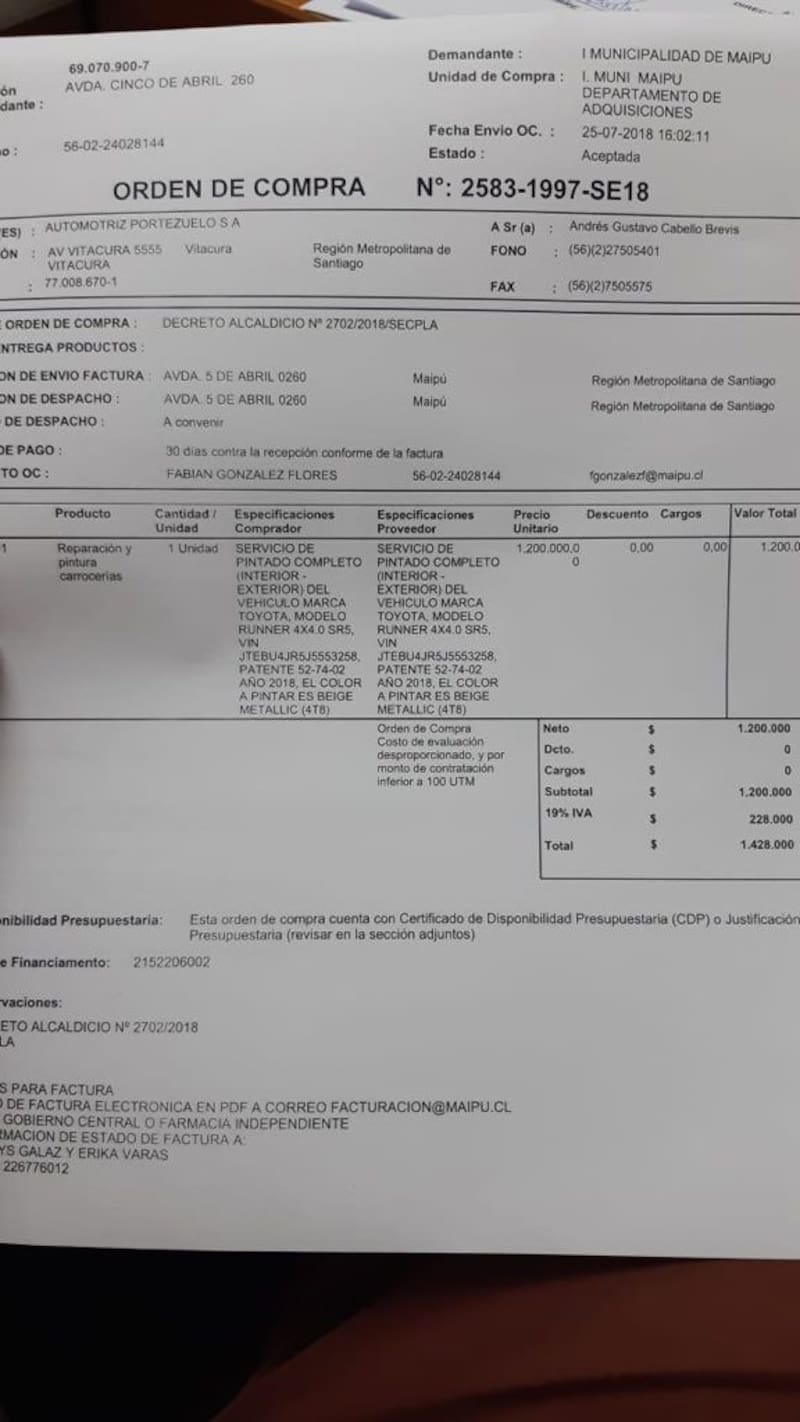 Pues bien, todo partió el 14 de mayo de 2018, día en que la municipalidad de Maipú realizó la compra de un Toyota 4Runner del año a la automotora Portezuelo S.A (de Vitacura). Un vehículo 4x4 que adquirió por más de 23 millones de pesos.