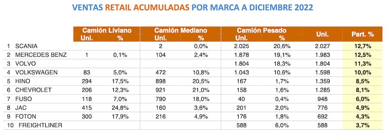 Con esto, el fabricante sueco se hizo del 20,34%, de Market Share en ese segmento y del 12,7% del total (considerando ligeros, medianos y pesados), convirtiéndose así en el nuevo número uno del competitivo segmento de camiones al escalar dos posiciones en la tabla general en comparación al año anterior, desplazando a Mercedes-Benz y Volkswagen, marcas que fueron primera y segunda respectivamente en 2021.
