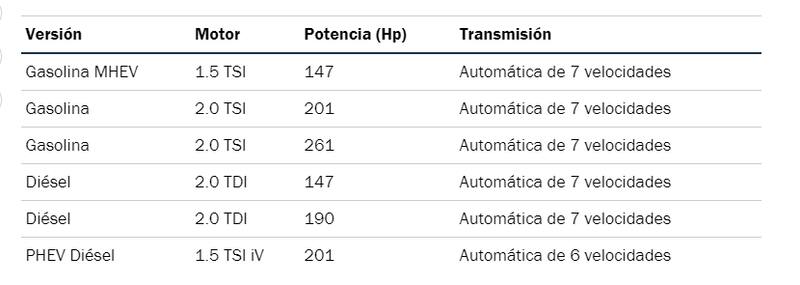Sin dudas, la versión más llamativa es la PHEV (híbrido enchufable) presenta un motor a gasolina de 1.5 TSI y un pequeño motor eléctrico. Tal como señalamos en la tabla, desarrolla una potencia máxima de 201 Hp y es manejada a través de una transmisión DSG de seis marchas. Es tracción delantera y la batería que dispone es de iones de litio cuya capacidad es de 12,7 kWh a los 25,7 kWh.