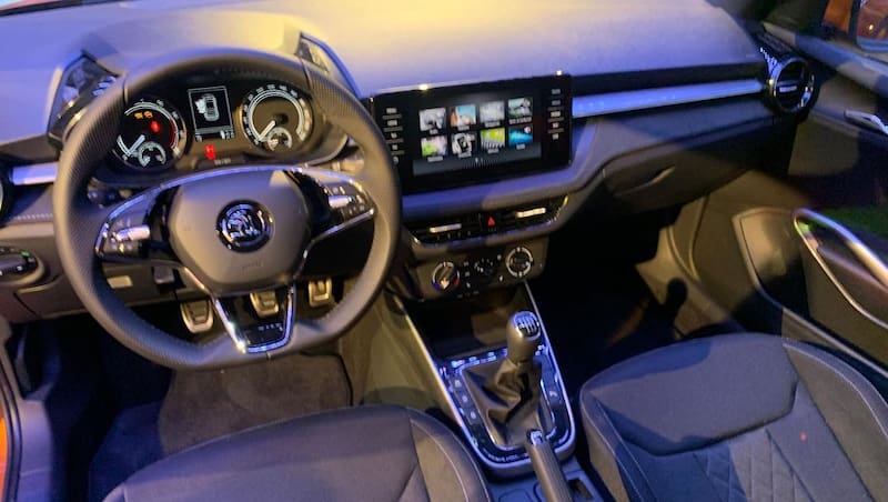 En el interior, destaca una pantalla de infoentretenimiento de hasta 9,2″, sumado a salidas de aire circulares, el nombre Fabia en los laterales del cuadro de instrumentos.