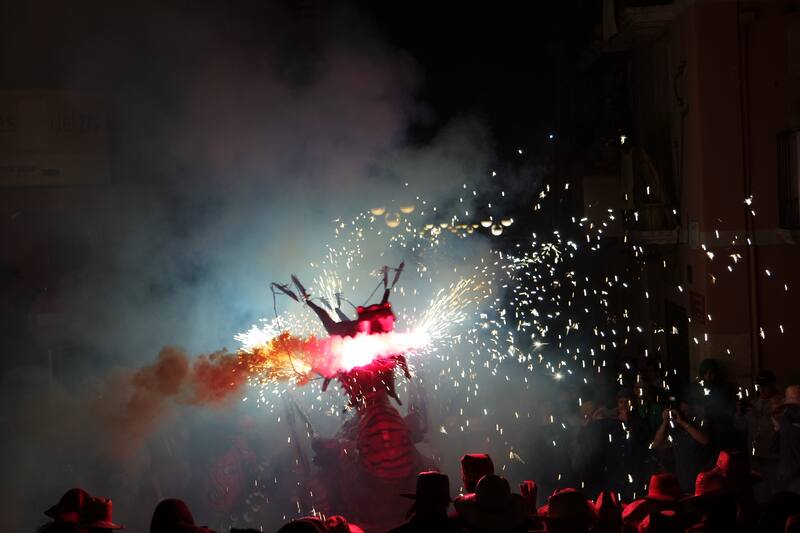 Por último, una de las actividades de Santa Tecla que más deslumbran de esta ciudad milenaria es el Correfoc. Este es un enorme desfile pirotécnico de fuegos artificiales disparados por entremedio de la ciudad con bestias y dragones bien ornamentados. Todo inicia al anochecer del día de clausura en la Plaça de la Mitja Lluna al ritmo de tambores e instrumentos de viento.