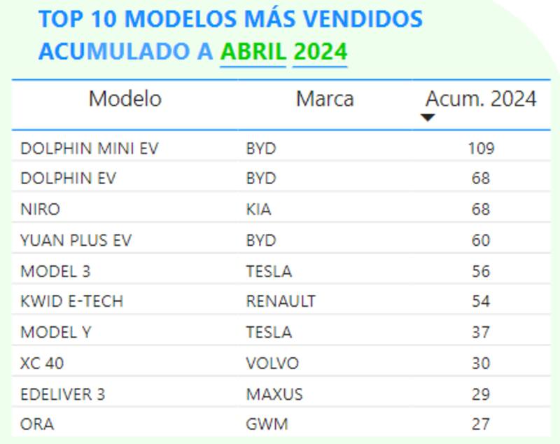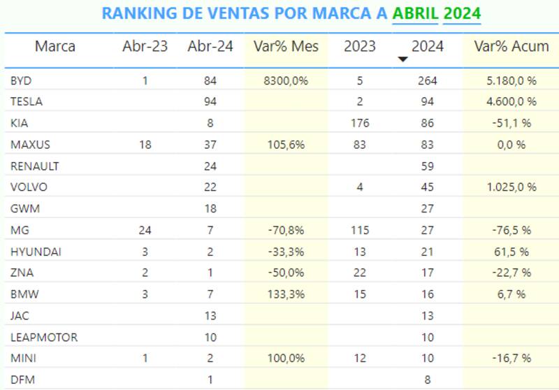 En abril, la marca californiana matriculó 94 unidades, superando por 10 unidades a BYD, su más cercano perseguidor, aunque de todas maneras la marca china de autos eléctricos encabeza el registro anual con 294 unidades.