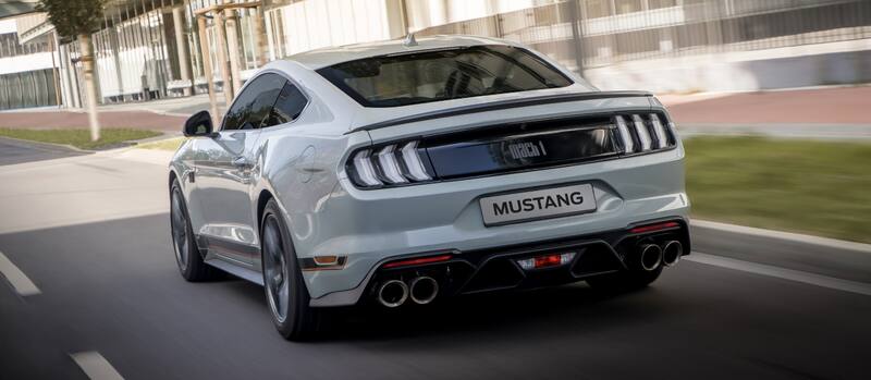 El Mach 1 posee una nueva parrilla que se remonta al modelo original con una malla tridimensional, nariz de tiburón, elementos de lámparas ficticias y la insignia de diseño magnético de bajo brillo del característico caballo centrado en la rejilla. La acentuación magnética y el negro en todo el vehículo proporcionan un aspecto premium, mientras se mantiene fiel a la herencia audaz y musculosa de Mach 1, con otros detalles como las tapas de los espejos y el alerón trasero.
