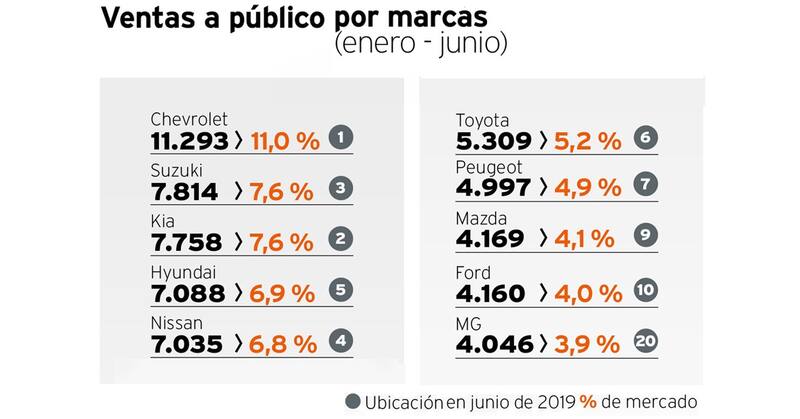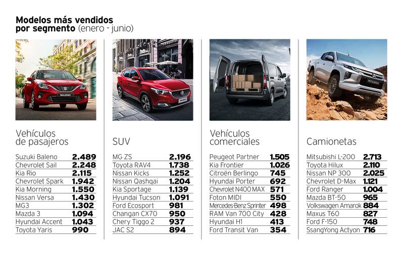 En este contexto, las firmas que mejor han surcado la tempestad, según los indicadores de la Asociación Nacional Automotriz, son Chevrolet, que se consolida como la marca más exitosa del país; Suzuki, que se impone con el vehículo de pasajeros más vendido de los seis primeros meses, y MG, que destrona al todopoderoso Toyota RAV4 en el ranking de los SUV más vendidos, y da un salto para entrar al top ten de las firmas de mayores ventas en este convulsionado primer semestre.