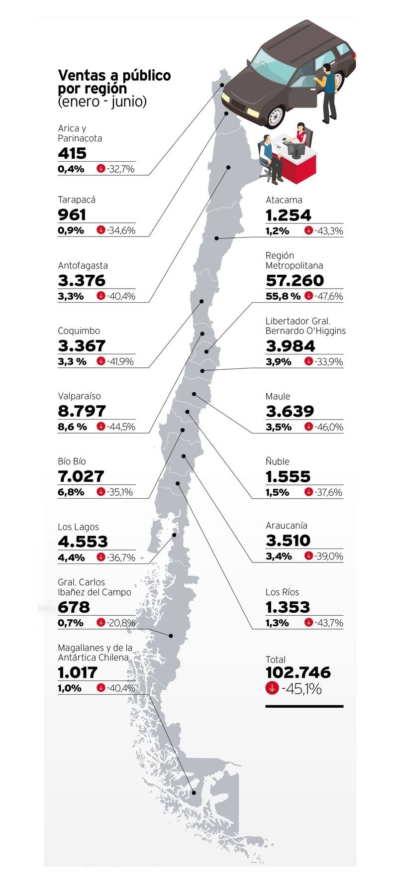 En cuanto a la distribución de ventas a nivel de país, la Región Metropolitana fue la que experimentó el mayor descenso frente a los mismos seis meses del año anterior, seguido por la Región del Maule.