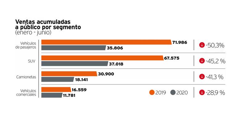 En cuanto a las ventas, por segmento, estas fueron lideradas por los SUV, ratificando una tendencia a nivel global. En estos seis meses, el que más perdió terreno fue el de los vehículos de pasajeros, con un retroceso del 50,3% en comparación al mismo período anterior.