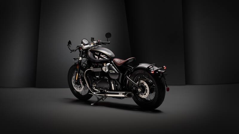 El modelo ostenta un inédito esquema de pintura que combina los tonos Carbon Black y Matt Carbon Black con la Union Jack en plata y los gráficos Bobber de aspecto cepillado, mientras que el depósito de combustible luce franjas doradas y el emblema triangular de Triumph.