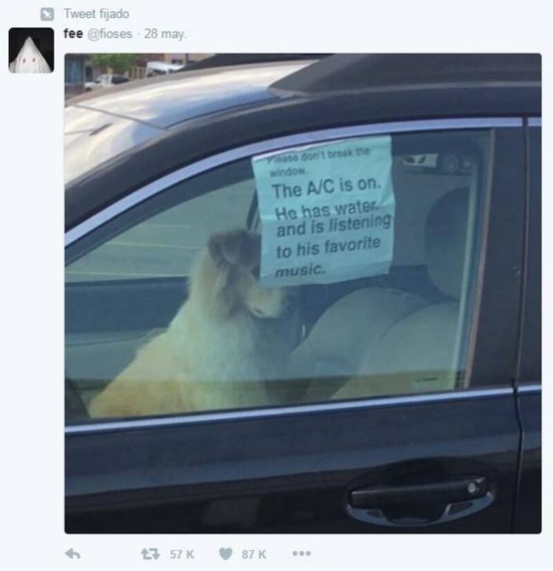 En este particular tuit, un peatón encontró a un perro dentro un auto. Sin embargo, el dueño del perro dejó un mensaje pegado en la ventana asegurando que su perro se encontraba sin problemas. ”Por favor no rompas el vidrio”, decía en el encabezado. ”El aire acondicionado está encendido. Él tiene agua y está escuchando su música favorita”. El perro parece estar cómodo sentado justamente en el asiento del conductor.