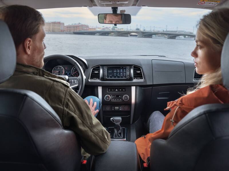 En la consola central, junto con el selector de modos de tracción en forma de rueda, hay dos botones ciegos que denotan otra vez poco cuidado en el detalle. La pantalla central táctil no refuta esa impresión de poco esmero, porque más allá de no ser compatible con CarPlay, que podría entenderse, tiene un navegador solo ajustable en idioma ruso. Al menos tiene conexión Bluetooth y una toma USB dentro de la guantera (la tapa puede cerrarse incluso con el cable de por medio). Los mandos de audio integrados en el volante están a la derecha, contrariamente de como que ocurre en casi todos los vehículos.