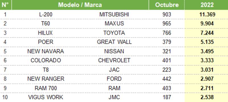 Por modelos, la Mitsubishi L-200 sigue firme en el primer lugar, con 11.369 ejemplares vendidos en 2022. De cerca, le sigue la Maxus T60 (9.904 unidades totales), que en octubre pasado se erigió como la pick-up más vendida del mes, con 965 matriculaciones.