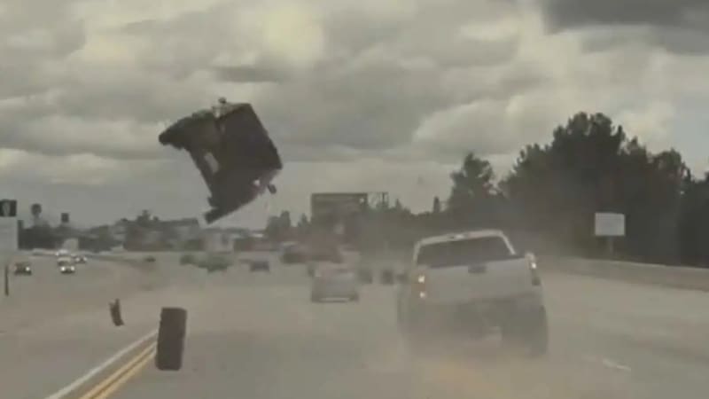 Entonces, el Kia dio varias vueltas, para luego aterrizar sobre el capó y volverse a poner “en pie”. Por su parte, la rueda suelta del Silverado volvió a la escena, golpeándolo nuevamente, pero esta vez chocando contra la parte trasera del vehículo.