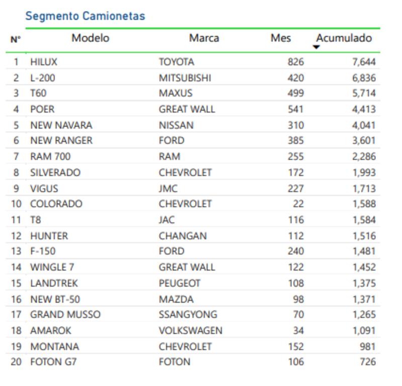 Por modelos, la Toyota Hilux continúa firme en la punta, con 7.644 unidades vendidas. Le sigue de cerca su coterránea Mitsubishi L-200 con 6.836. Cierra el podio la china Maxus T60 con 5.714 ejemplares comercializados.