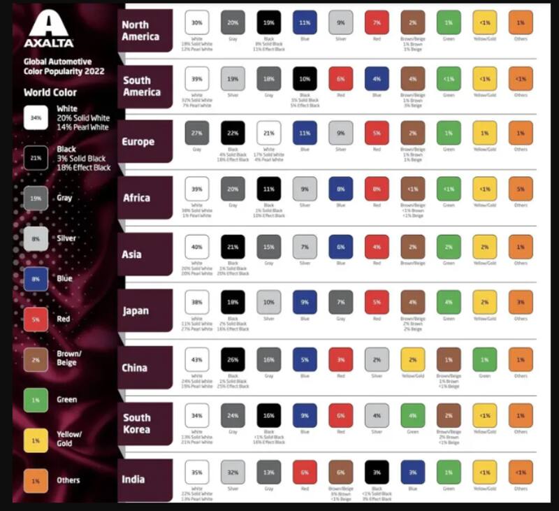 De acuerdo con ello, el blanco fue el color favorito de los consumidores a nivel mundial, acaparando el 34% de la carrocerías. Le sigue el negro con un 21% de las preferencias, quedando en un tercer lugar el gris, con un 19%.