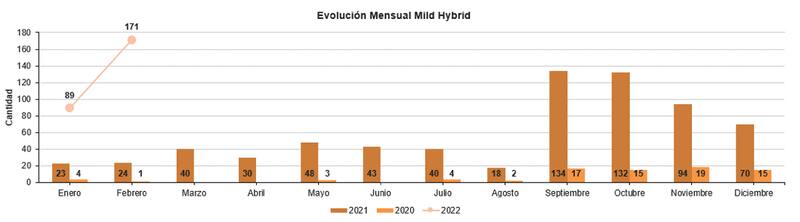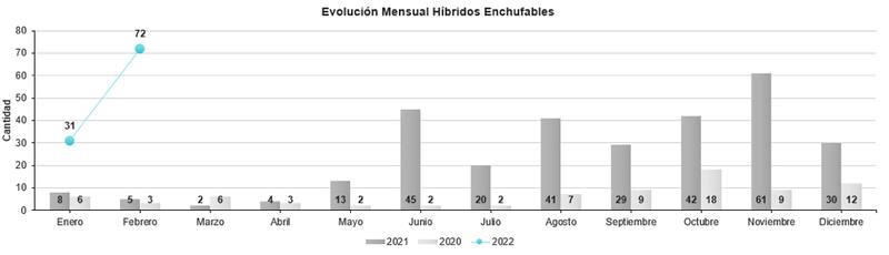 Por último, los híbridos enchufables (PHEV) alcanzaron las 72 unidades comercializadas en febrero, consolidando su mejor registro para el segundo mes del año y acumulando 103 unidades en 2022.