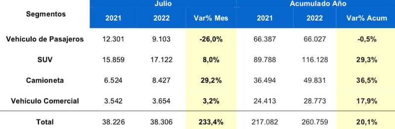 Con estos resultados de julio, el acumulado anual en Chile llegó a 260.759 unidades, lo que implica un aumento de 20,1%, frente al mismo lapso de 2021.