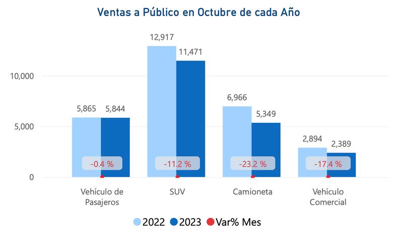 Al ver la venta de autos nuevos en el acumulado de 2023, las cifras ascienden a 261.132, lo que refleja una disminución de 27,7%, respecto de los primeros diez meses de 2022.