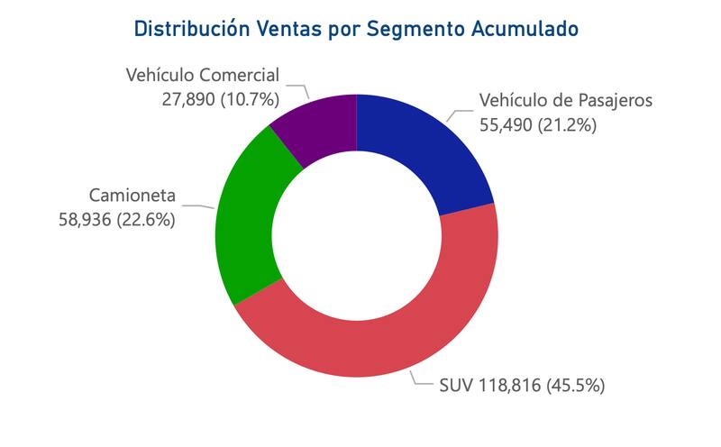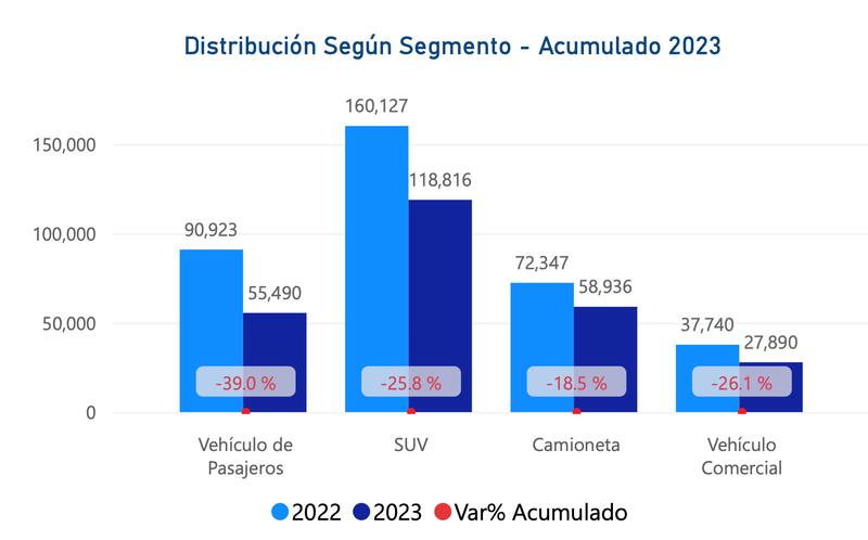 En el acumulado, el segmento que más ha retrocedido es el de Pasajeros (-39%), seguido por Comerciales (-26,1%), SUV (-25,8%) y Camionetas (-18,5%).