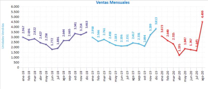Durante agosto se vendieron 4.499 unidades, un alza del 173% respecto del mismo mes anterior, crecimiento del que no se tenía registro en la Anim.