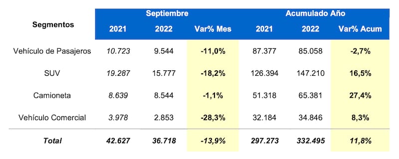 En cuanto a segmentos, el descenso se evidenció para todos. Así, la venta de vehículos comerciales en septiembre disminuyó 28,3% (2.853 unidades), frente al mismo período del año anterior; los SUV cayeron 18,2% (15.777 unidades); Pasajeros bajó 11% (9.544) y las camionetas retrocedieron 1,1% (8.544).
