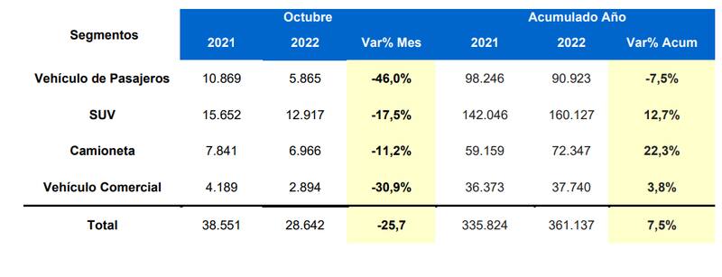 Si nos adentramos a los segmentos, el descenso se evidenció en todos: la venta de vehículos de pasajeros en octubre disminuyó un 46% (5.865 unidades) frente al mismo periodo del año anterior; la de comerciales cayó un 30,9% (2.894 unidades); seguido de los SUV con una baja del 17,5% (12.917 unidades) y finalmente las camionetas con solo una caída del 11,2% (6.966 unidades).