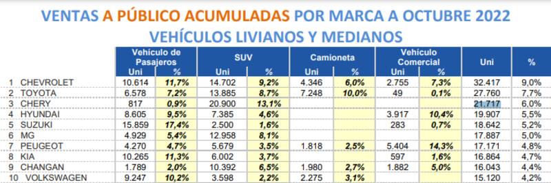 Por marcas, las ventas acumuladas durante el 2022 las sigue liderando Chevrolet con 32.417 unidades seguido por Toyota con 27.760 unidades y, más atrás, queda Chery con 21.717 vehículos nuevos comercializando.