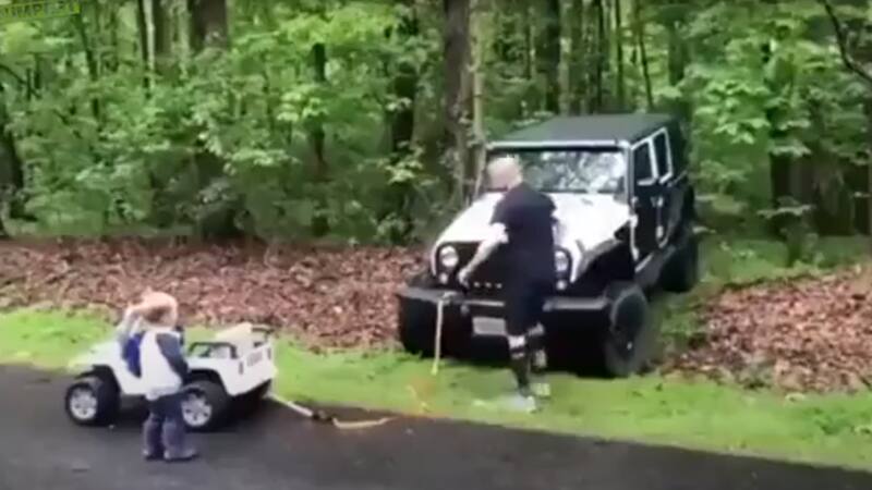 Controversia por un padre que le permite a su pequeño “remolcar” su vehículo con un Wrangler de juguete ha provocado diversos comentarios.