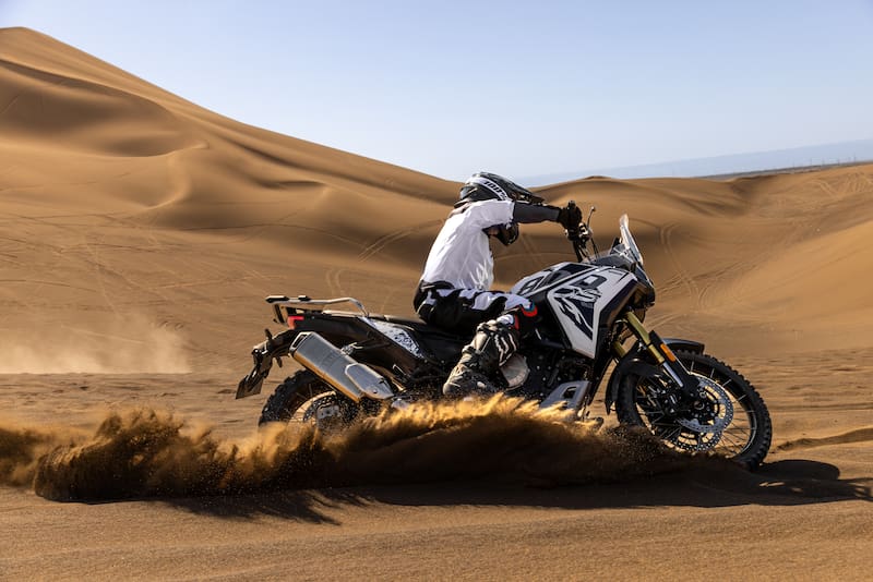 El sistema de frenos está a cargo de Nissin, con doble disco delantero y pinzas radiales de cuatro pistones. El ABS es desconectable de forma selectiva, ya sea en la rueda trasera o en ambas, una función pensada para facilitar la conducción fuera de ruta. A esto se suman llantas de radios cruzados de 21 pulgadas adelante y 18 pulgadas atrás, junto a neumáticos Pirelli Scorpion Rally STR sin cámara.