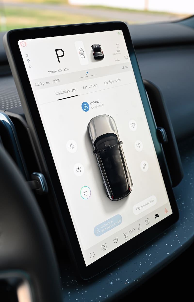Puertas adentro, el EX30 luce moderno, sofisticado y sobretodo, bien terminado. Destaca la gran pantalla central que comanda todas las funciones del interior, careciendo de una pantalla aparte para el cuadro de instrumentos. Esta pantalla está integrada a Google, por lo que cuenta con el asistente por voz disponible para responder consultas y complementar la conducción con una experiencia superior.