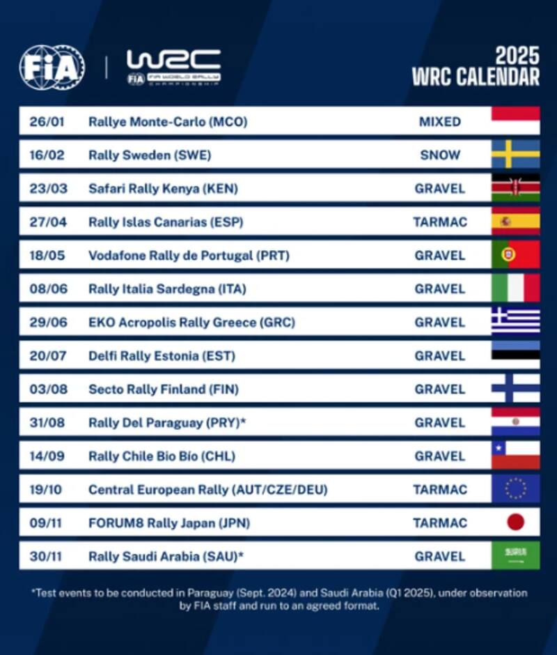 El Presidente de la FIA, Mohammed Ben Sulayem, dijo: “Es fantástico ver un calendario de pruebas tan completo para la temporada 2025 del WRC. Junto a los lugares clásicos que los aficionados conocen y aman, la entrada de nuevos rallyes en España, Paraguay y Arabia Saudita añade todavía más emoción y refleja la diversidad global de los competidores y aficionados a los rallyes por igual”.