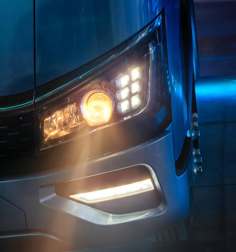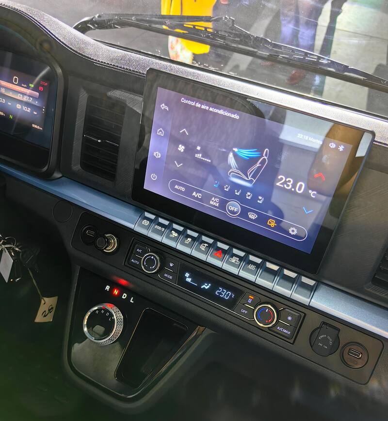 Este tablero se compone por una pantalla de 7 pulgadas que entrega toda la información referente al manejo, porcentaje de la batería y cantidad de aire en los dos estanques que el camión equipa para las funciones complementarias. Mientras que en el centro del tablero se encuentra la pantalla de 8 pulgadas que comanda el sistema de audio, que cuenta con conexión bluetooth y USB. Además, incorpora una útil cámara de visión en 360 grados, con vistas focalizadas y generales de lo que rodea al camión para ejecutar maniobras de estacionamiento seguras.