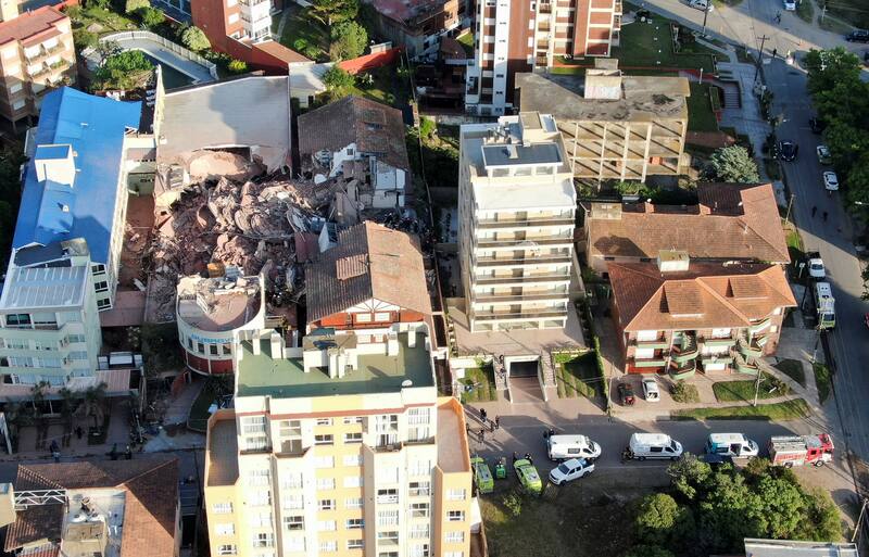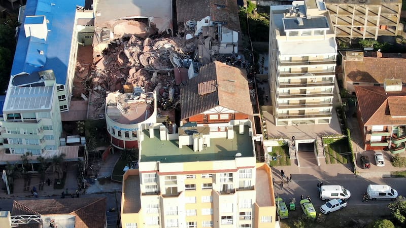 Los equipos de emergencia siguen trabajando entre los escombros del Apart Hotel Dubrovnik, ubicado en Villa Gesell, Buenos Aires, Argentina, luego que el edificio de diez pisos se desplomara la madrugada de este martes en medio de trabajaos de remodelación.