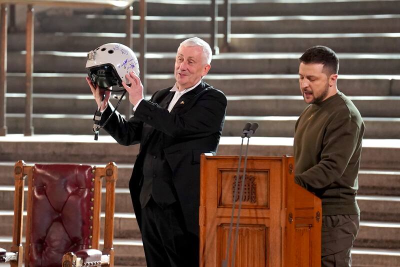 En un gesto mordaz y dramático, Zelensky le entregó al presidente de la Cámara de los Comunes un casco de la fuerza aérea ucraniana, con la inscripción de un piloto ucraniano: “Tenemos libertad. Danos alas para protegerla”.