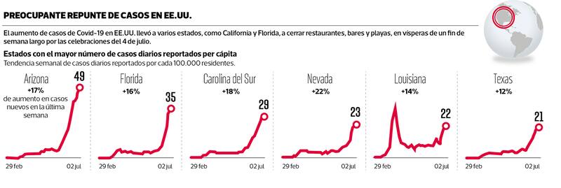 Arizona, California, Carolina del Norte, Tennessee y Texas reportaron un número récord de contagios el miércoles, según CNN. Hay temor por festejos del 4 de julio.