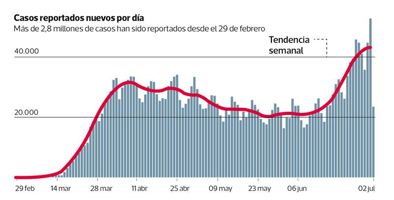 El Departamento de Salud de Florida reportó 10.109 nuevos casos este jueves, totalizando así 169.106 infecciones. Se trata del mayor incremento de un día en ese estado desde que comenzó la pandemia en EE.UU., según un recuento de Reuters.