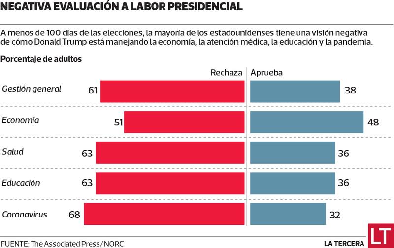 Encuesta reveló las dificultades que aguardan al mandatario republicano en su duelo contra el demócrata Joe Biden. Además, apenas el 32% de la población aprueba la gestión del presidente con respecto a la lucha contra el coronavirus, un piso que no se había visto antes