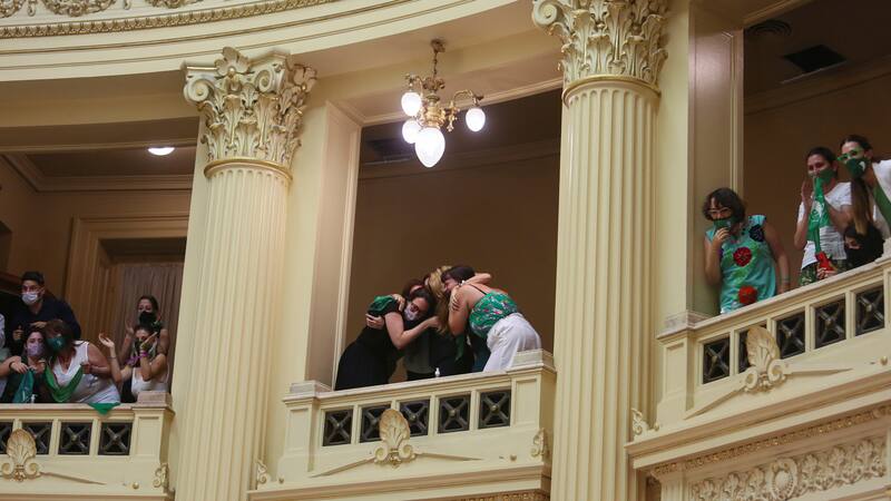 Frente al Congreso, una multitud de activistas a favor del aborto, que se identifican con el color verde, festejó como la sanción de la ley. “Aborto legal en el hospital”, exclamaron entre abrazos y lágrimas.