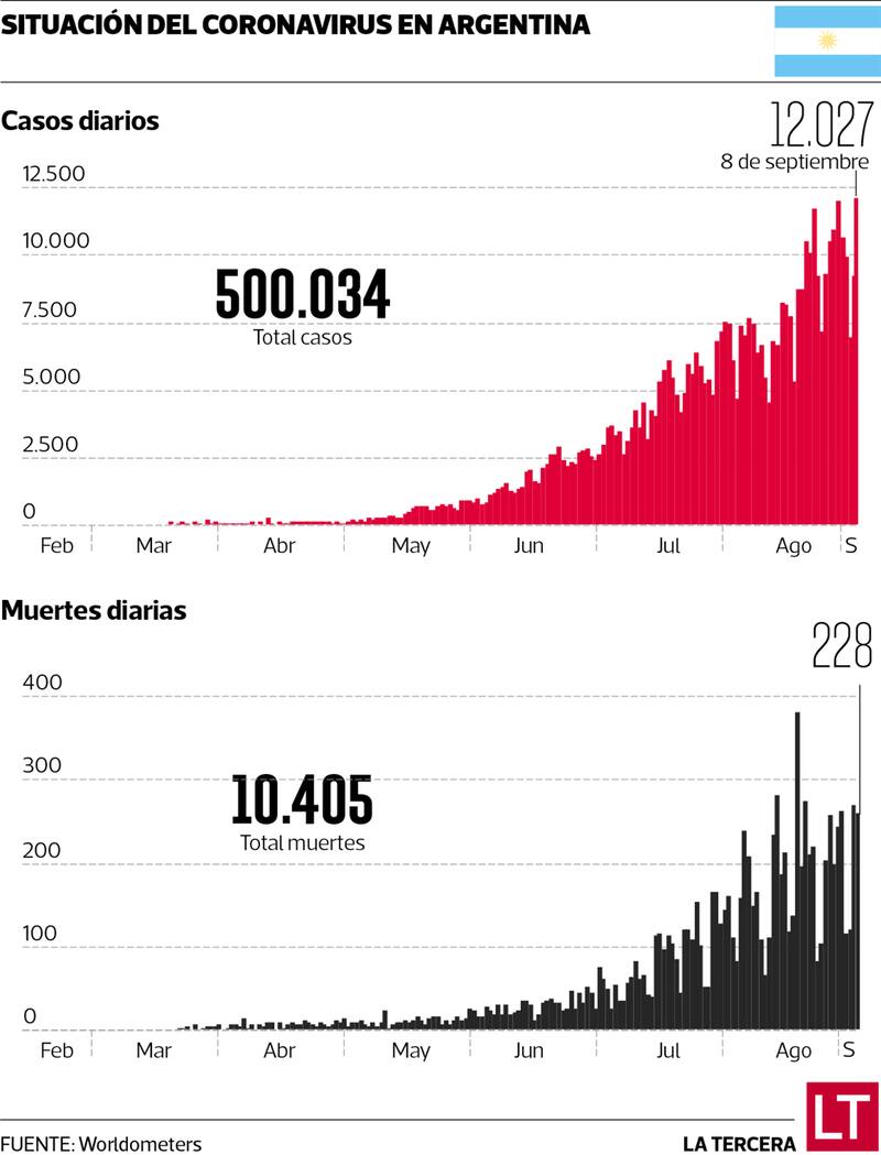 El lunes, Argentina sumó más de 10 mil muertos y este martes superó los 500 mil casos. Ambas curvas son agudas y empinadas, y a nivel de muertes el país ya se sitúa en el puesto 16 de las naciones con más fallecidos, mientras que a nivel de contagios entró en el “Top 10”. En un mes los casos se duplicaron, mientras que las muertes aumentaron en 125% desde el 8 de agosto. Sin embargo, la tasa de letalidad del virus sigue manteniéndose baja: 2,1%. La tasa de mortalidad, en tanto, es de 225 por millón de habitantes.