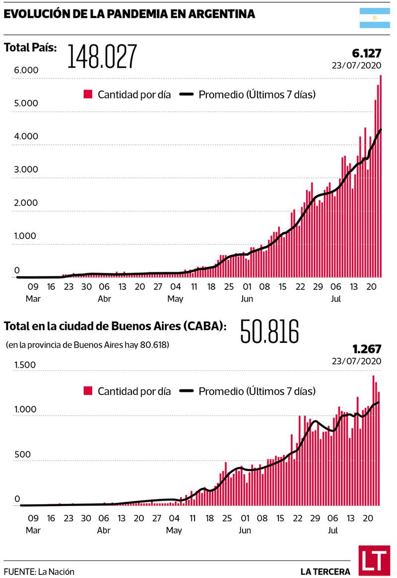 Idas y vueltas entre confinar y desconfinar. En ese dilema se ha mantenido Argentina desde la llegada de la pandemia por Covid-19 al país en marzo, y especialmente en la capital y el Área Metropolitana de Buenos Aires (AMBA), que comprende también al conurbano bonaerense. Hace solo una semana que esta región -que tiene una población similar a la de Chile- salió de una estricta cuarentena de 17 días, sin embargo, esta misma semana Argentina anotó su récord de casos: 6.127 en las últimas 24 horas.