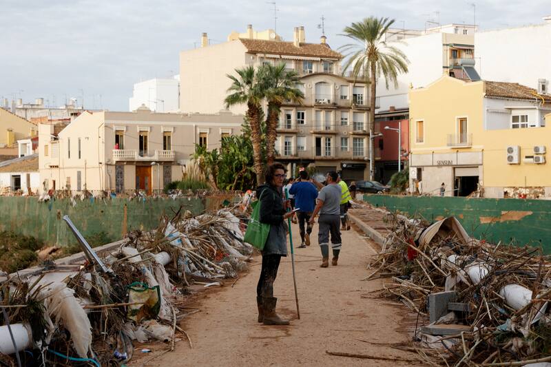 Las tareas de limpieza, en las que colaboran bomberos, equipos municipales, la UME y centenares de vecinos, también siguen con la tarea urgente de retirar el lodo, los escombros y los cientos de vehículos que han quedado apilados en calles y carreteras.