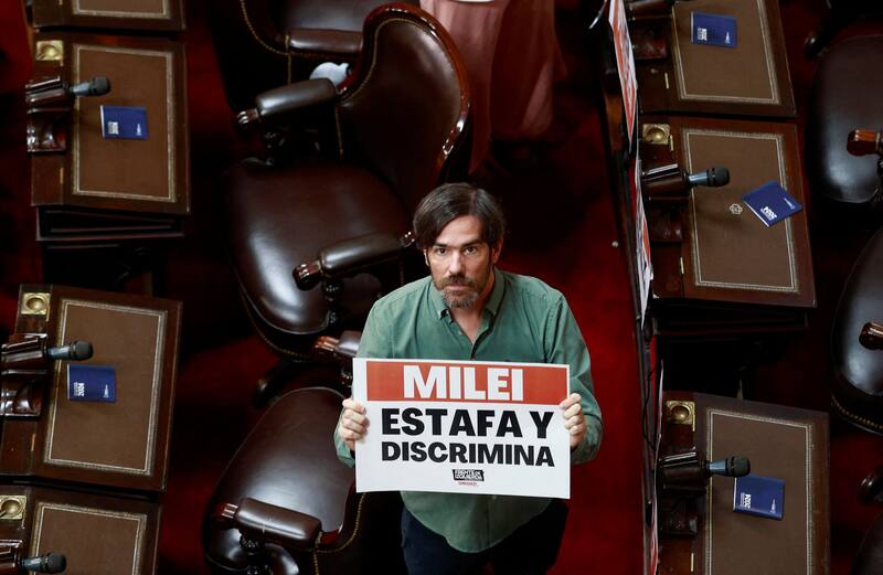 La totalidad de Unión por la Patria, la coalición kirchnerista, no asistió. La izquierda argentina tampoco estuvo presente, pero dejaron pegados en sus asientos carteles con la frase “Milei estafa y discrimina”.
