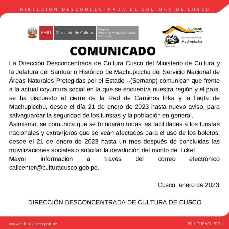 Mediante un comunicado, la Dirección Desconcentrada de Cultura Cusco señaló que “frente a la actual coyuntura social en la que se encuentra nuestra región y el país, se ha dispuesto el cierre de la Red de Caminos Inka y la llaqta de Machupicchu, desde el día 21 de enero hasta nuevo aviso”.