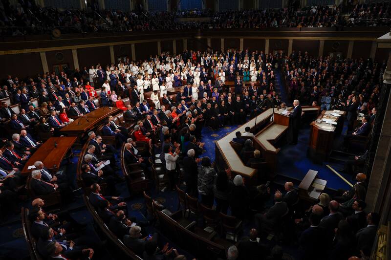 Biden, ante una sesión conjunta de la Cámara de Representantes y el Senado, abrió su intervención con una crítica directa a Trump por unos comentarios en los que invitaba al presidente ruso, Vladimir Putin, a invadir otras naciones de la OTAN si no gastaban más en defensa.