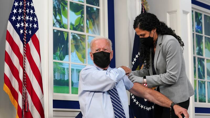 Biden fue inoculado en un acto en la Casa Blanca ante la prensa. “Sé que no lo parece, pero tengo más de 65 años, bastantes más, y por eso hoy me pongo la inyección de refuerzo”, explicó.