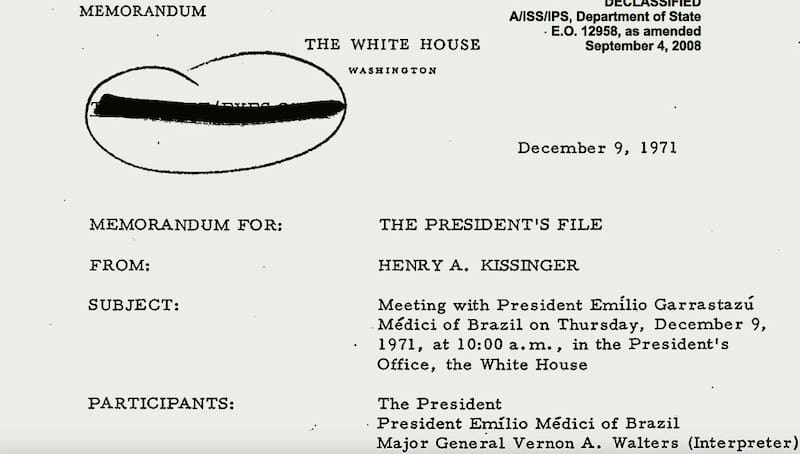 “La respuesta fue la siguiente: El presidente Médici dijo pensar que (los militares de Chile) eran capaces, completando que Brasil intercambiaba muchos oficiales con los chilenos, y dejó claro que Brasil estaba trabajando para ese fin (un golpe en Chile). El presidente (Nixon) dijo que era muy importante que Brasil y Estados Unidos trabajaran lado a lado en ese campo. Nosotros (Estados Unidos) no podríamos asumir el liderazgo, pero si los brasileños piensan que hay algo en que pudiéramos ayudar en esa área, le gustaría que el presidente Médici le avisara. Si dinero u otra ayuda discreta fueran necesarios, nosotros podríamos proporcionarlo. Eso debería ser mantenido bajo el máximo sigilo. Pero deberíamos impedir nuevos Allendes y Castros e intentar, donde fuera posible, revertir esas tendencias”.